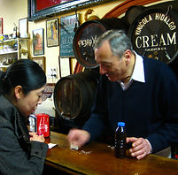 この辺りの古い店では伝票の代わりにカウンターにチョークで値段を書きます。この店のシェリー酒は辛口から極甘口まで7種類を樽から注いでくれます。カウンターやテーブルで飲んで行く人も居れば、空のボトルを持って買いにくる人もいます。私も持っていたミネラルウォーターのボトルに入れてもらう事にしました。これを大事に持って帰っていつも皆さんに食べて頂いている”黒豚とハモンのソテー シェリー酒仕上げ”をドライではなくこのオロロソ・セミセコで仕上げてみようと思います。ご興味がおありの方は是非お声をかけて下さいね。